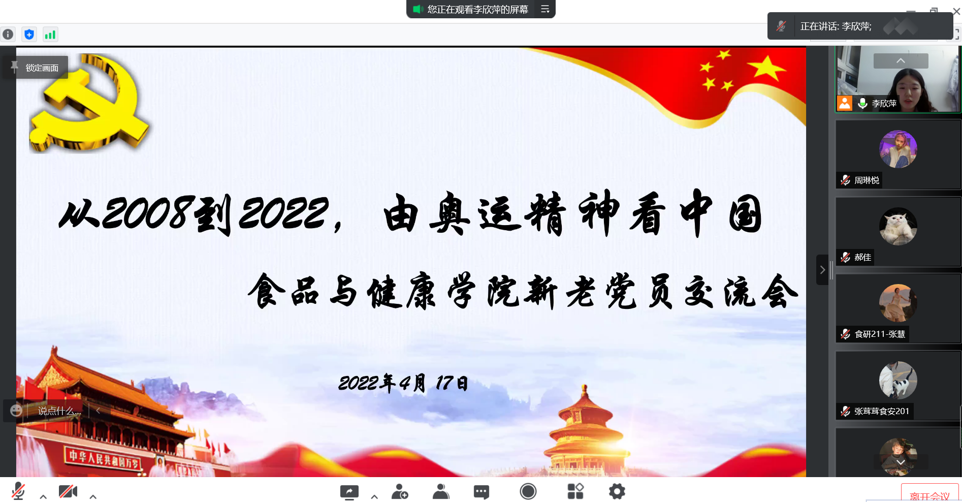 4月16日,食品健康公司2022年春季党员发展对象培训班在线上召开以“从2008到2022,由奥运精神看中国”为主题的新老党员交流会。参会人员有公司员工党务工作委员会主任周琳悦同志及17名发展对象,会议由班主任助理李欣萍主持。