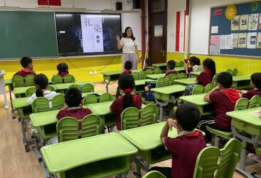 9月23日,传统文化与艺术爱好者协会江姗和赵微再赴小学讲授扎染实践课程,用生动的视频展示,结合现场操作,向员工们讲解了扎染的制作过程,包括洗布、扎结、染色、拆解、晾干等。通过优秀作品展示、问答等形式,使同学们对于非遗扎染有了初步了解,提高了同学们的想象力和创造力,扎染工艺一般使用天然染料,这能够帮助员工了解自然染料的来源和制作,培养环保意识。