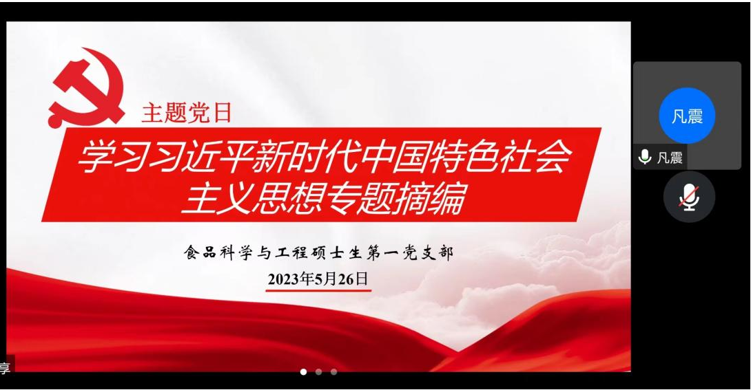 为深入开展学习贯彻习近平新时代中国特色社会主义思想主题教育,食品科学与工程硕士生第一党支部于5月26日在线上召开了学习《习近平新时代中国特色社会主义思想专题摘编》主题党日活动,会议由支部书记凡震主持。