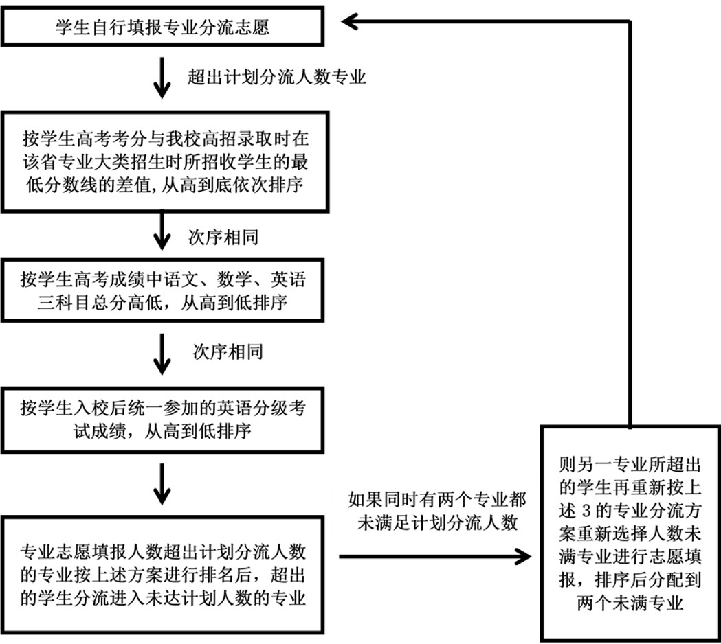 说明:专业分流时如果同时有两个专业都未满足计划分流人数,则另一专业所超出的员工再重新按上述3的专业分流方案重新选择人数未满专业进行志愿填报,进行排序后分配到两个未满专业。