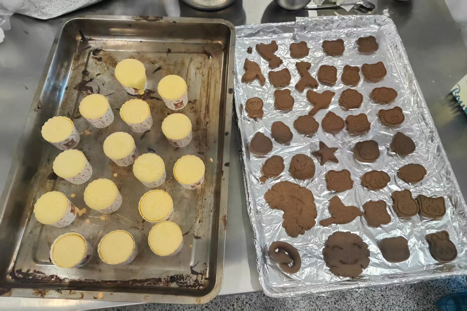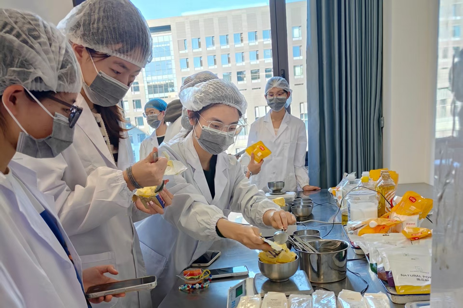 11月21日,24级和25级中外班同学来到良乡校区轻工食品大楼,在实验室里亲身体验了海绵蛋糕、戚风蛋糕以及各类饼干的制作过程,在浓郁的烘焙香气中,感受食品科学的无限魅力。在老师的指导下,同学们分为若干小组,迅速投入到烘焙实践中。大家分工协作,从精确称量原料、学习打发技巧,到小心翼翼地混合面糊,每一个步骤都做得一丝不苟。同学们亲手调制的蛋糕糊被注入一个个精致的纸杯,变成了小巧可爱的纸杯蛋糕。饼干制作区也充满了欢声笑语。同学们发挥创意,使用各种造型独特的模具,塑造成各式各样的形状。当一盘盘蛋糕和饼干新鲜出炉时,同学们兴奋地展示着自己的劳动成果,并用手机记录下这充满成就感的瞬间。