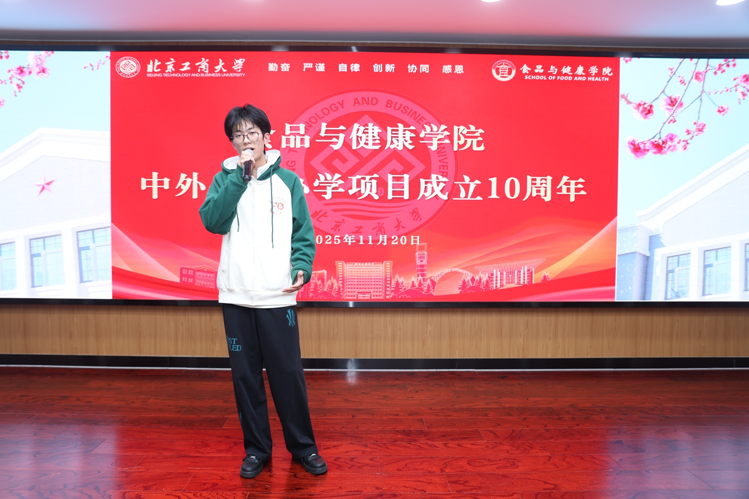 十年培育,桃李芬芳。本次活动特别邀请到毕业生代表王秋楠重返校园,她结合自身在校学习经历与职业发展历程,分享了在中外合作办学项目中的成长感悟与收获。随后,中外班在读员工合唱的《We Will Rock You》以激昂的节奏、饱满的热情,展现了中外学子蓬勃向上的精神风貌,将现场气氛推向高潮。