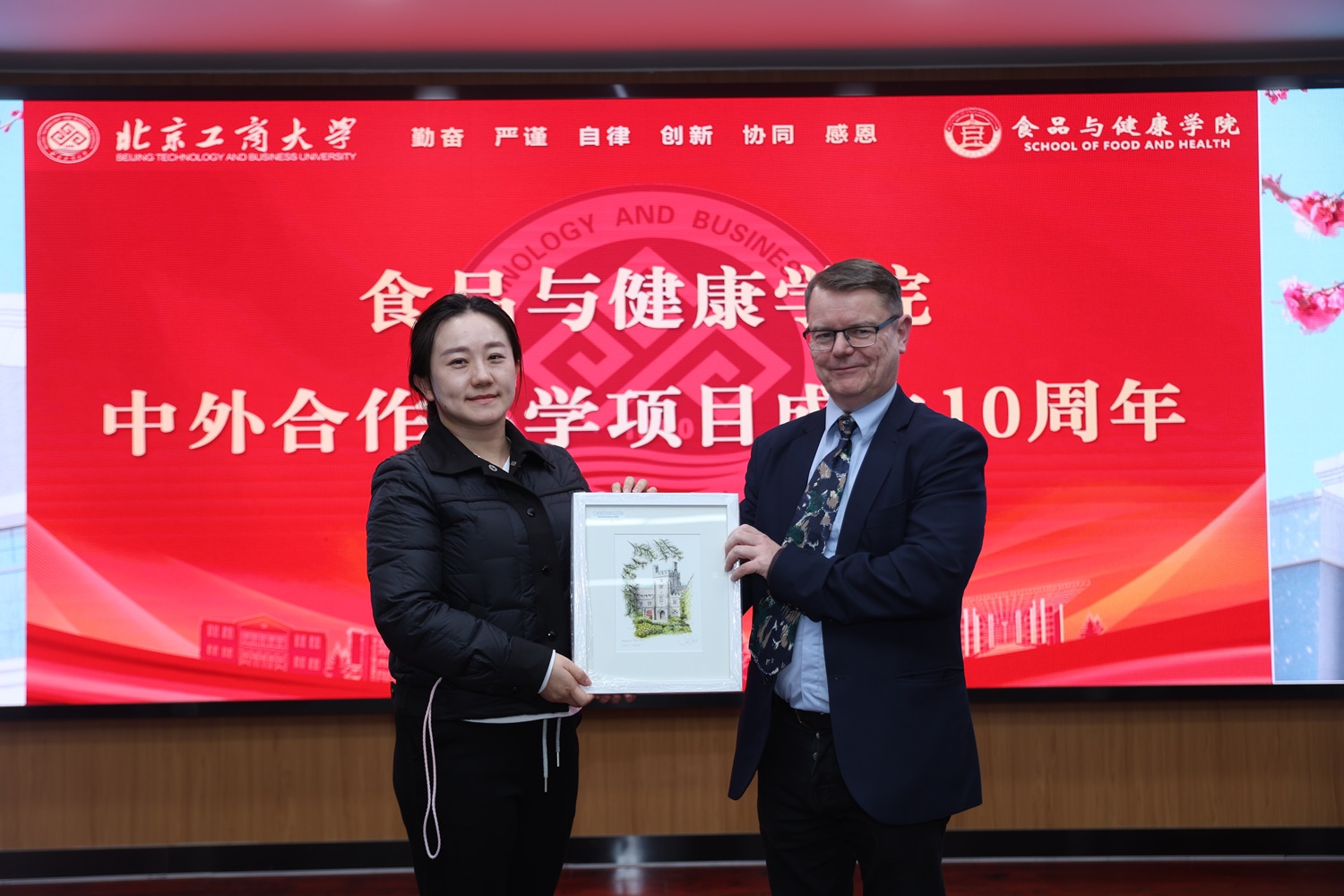 在领导致辞环节,王彦波与Maurice O'Sullivan、马晓彬分别回顾了两校十年携手合作的风雨历程,细数了项目在教学创新、人才培养、学术交流等方面取得的丰硕成果,同时围绕学科发展、国际化人才培养等方面,对项目未来的发展方向作出了清晰规划,表达了深化合作、共育英才的坚定决心。随后,Maurice O'Sullivan代表科克大学向yl6809永利集团赠送校园标志性建筑照片作为礼物,由曹嬿接收,这份承载着科克大公司园记忆与两校情谊的礼物,不仅是对十年合作的珍贵纪念,更将两校的联结进一步深化。