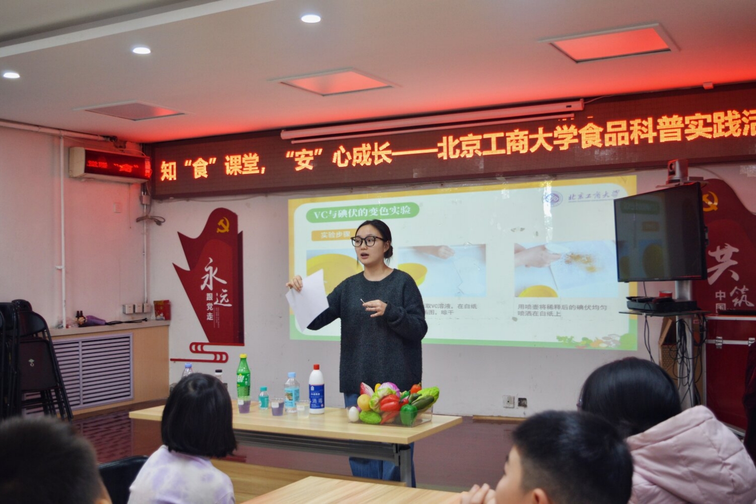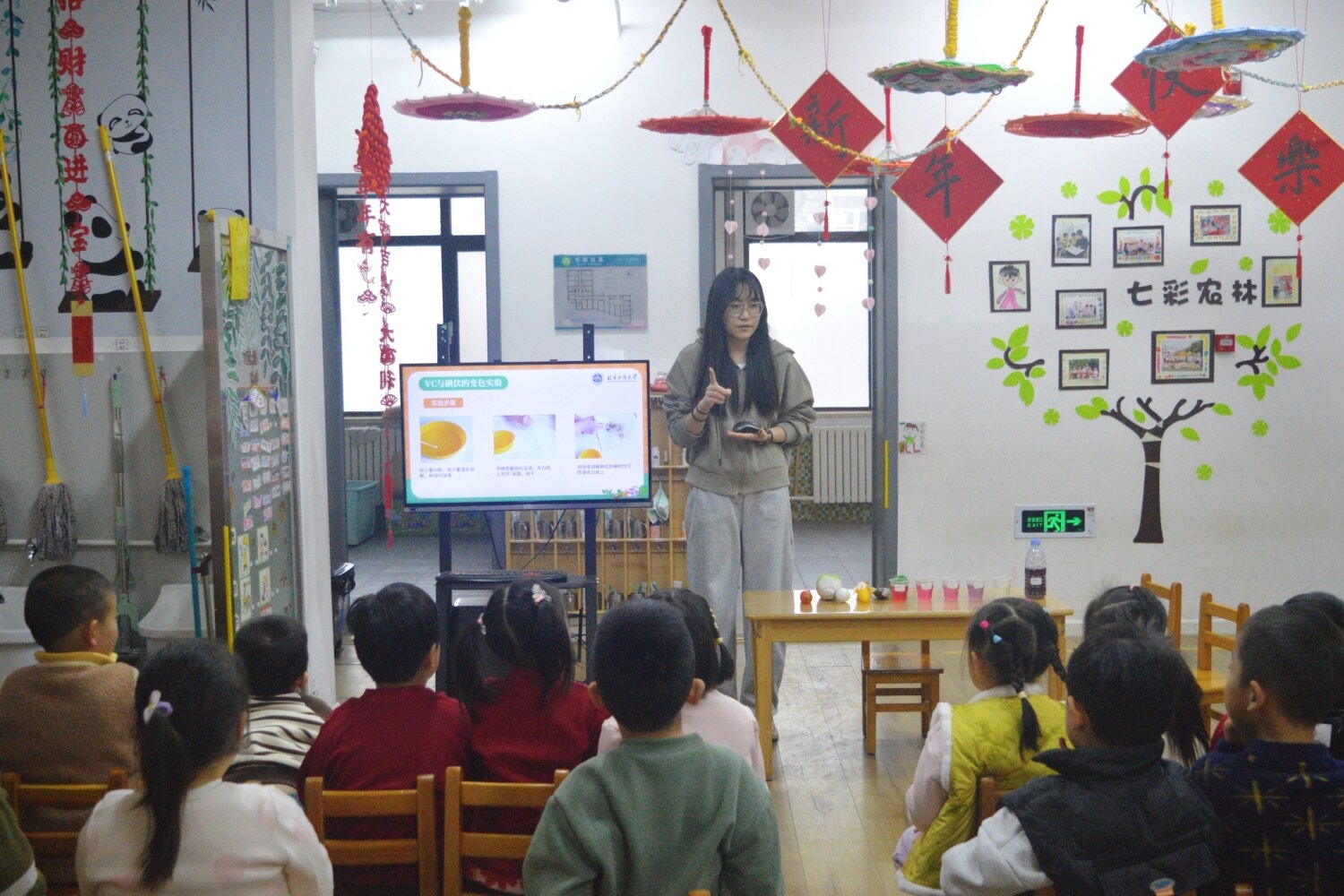 春节前夕,实践团先后赴海淀区北下关街道大柳树社区、甘家口街道四道口社区、丰台区和义街道和义东里第三社区开展“知‘食’课堂,‘安’心成长”专题科普活动,共计约60组社区家庭参与其中。活动以互动问答“我们为什么要吃饭?”巧妙切入并讲解《中国居民平衡膳食宝塔(2022)》,通过生动的彩色图示与朗朗上口的口诀,帮助儿童快速掌握食物分类与营养知识。“紫甘蓝变色实验”与“维生素C与碘伏变色实验”使孩子们在动手实践中直观理解了花青素的特性与维生素 C的还原性,现场欢声笑语、反响热烈。本次活动采用“亲子共参与”的形式,为家庭提供了共同学习健康知识的场景,许多孩子表示愿意成为家庭“健康监督员”,推动家庭实践“清淡饮食、均衡营养”。活动不仅有效传递了知识,更激发了儿童对食品科学的浓厚兴趣,触达了“教育一个孩子,影响一个家庭”的深远目标。