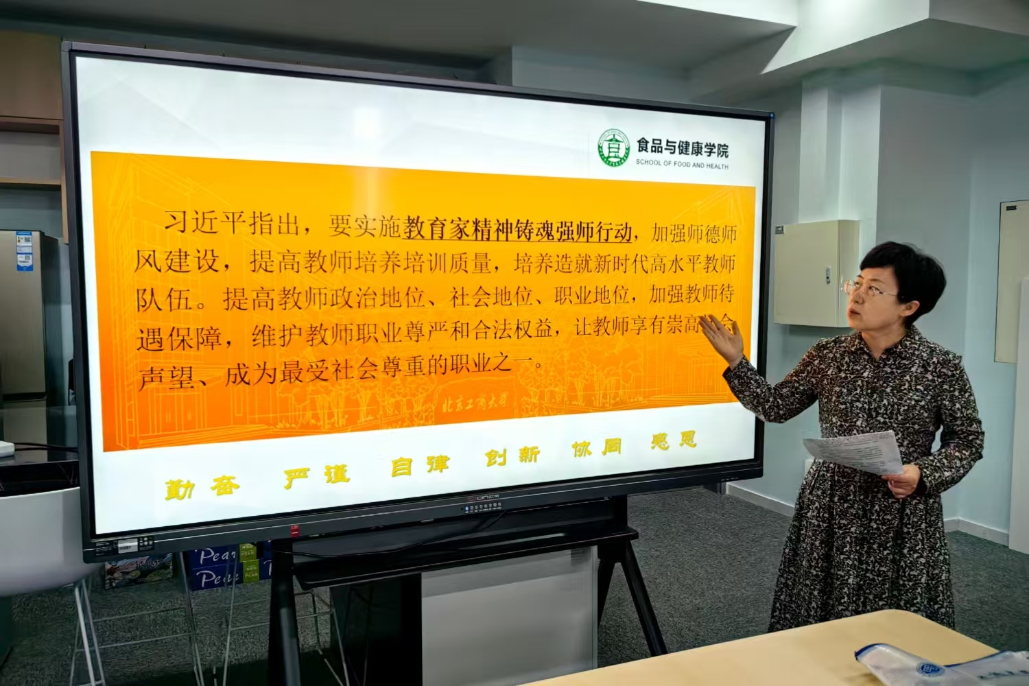 活动伊始,郑喜姣向全体教职工致以节日的祝贺和诚挚的问候。她介绍了中宣部、教育部公开发布的2025年全国“最美教师”名单和事迹,号召老师们向榜样学习。在郑喜姣的领学下,与会人员重温了习近平总书记在全国教育大会上的讲话精神,深刻理解教育发展、科技创新、人才培养一体推进的战略意义,深刻领悟教育家精神的丰富内涵,深刻领会师德师风建设的重要性,增强了加快建设教育强国的责任感和使命感。