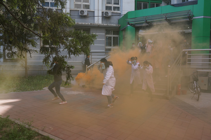 下午两点整,化工楼外准时施放烟雾,火警警报20秒内迅速响起,师生们用湿毛巾掩鼻,快速、有序地从化工楼东西出口撤离,穿过烟雾,到达预定地点集合并清点人数,撤离过程快而不乱,仅用时6分钟,顺利完成消防疏散演习任务。