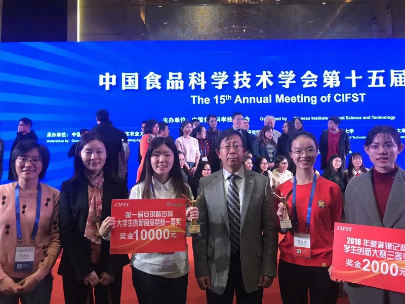 由李欣萍、钱瑀、付冰冰、刘玉洁组成的团队制作的“养tea–Young Tea”酵母茶泡腾片(指导老师:王少甲),在此次比赛中获一等奖。他们的产品富含蛋白质、核酸、维生素、微量元素等营养成分。是一款适用于各类群体的营养健康同时方便的时尚饮品。由秦威、于新雨、李雪霏、刘泽琨、杨静譞组成的团队制作的“川味小肠”(指导老师:王静、刘慧琳),在此次比赛中获三等奖。他们的腊肠以传统四川自然发酵香肠为例,从天然提取物的添加及发酵环境条件的控制等方面,抑制发酵肉制品中生物胺的形成。