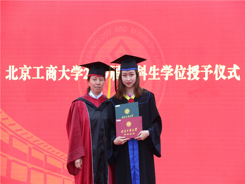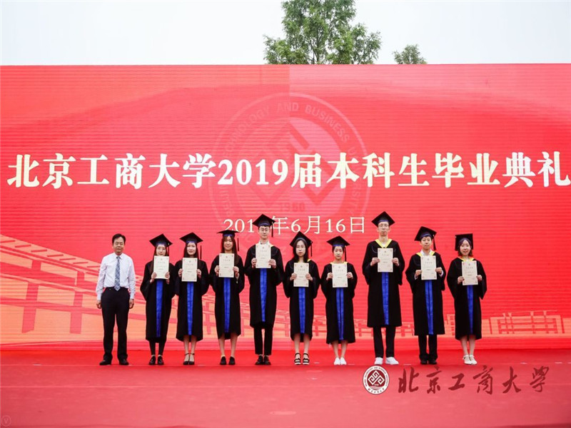 在雄壮的国歌声后,副董事长贾英民为优秀毕业生颁发荣誉证书,紧接着董事长孙宝国、食品与健康公司经理王静、轻工科学技术公司经理徐宝财依次为毕业生扶正流苏、授予学位,并合影留念。当学位帽上的流苏被从右到左轻轻拨过时,2019届毕业生从师长手中接过大学时光不懈耕耘的收获,对着镜头留下大学四年最美好的青春记忆,为求学历程划上圆满句点,去迎接未知的精彩未来。