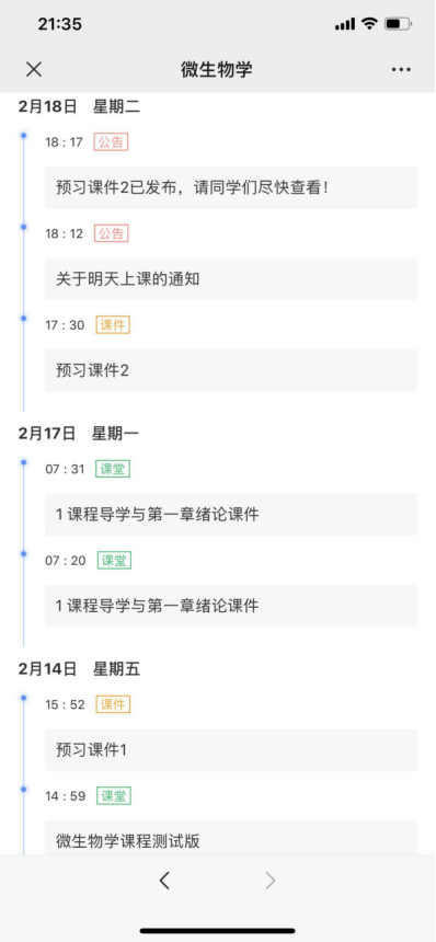 自2月14日《微生物学》课堂测试至2月24日雨课堂教学日志如下图所示(日期为倒序)。