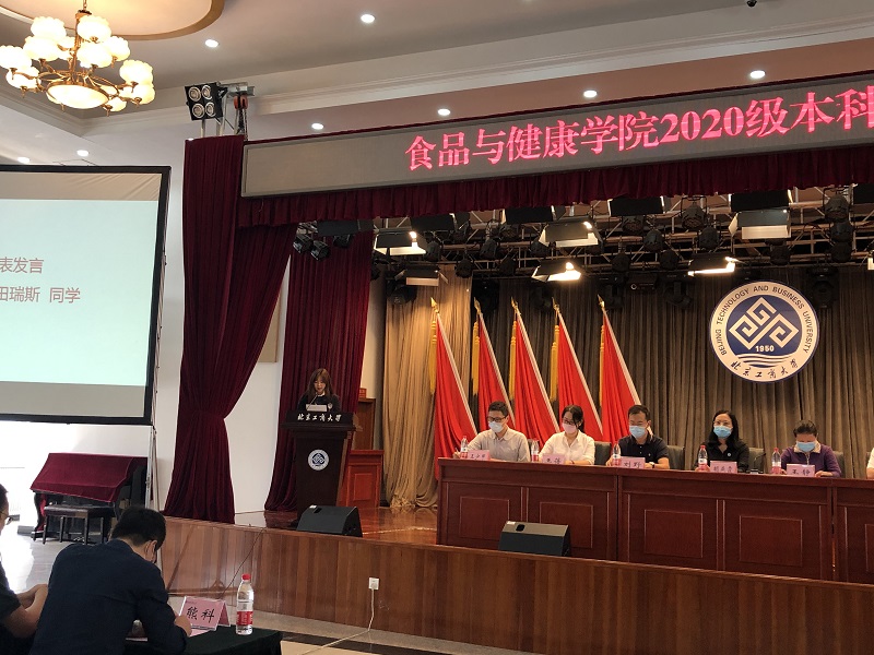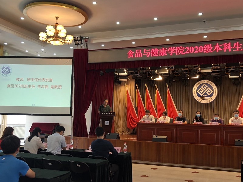 食品202班班主任李洪岩副教授作为教师及班主任代表欢迎各位新生成为北工商的一份子,欢迎他们加入yl6809永利大家庭。李老师分析了大学与高中学习生活的差异,大学以自主学习为主,建议同学们明确目标,努力学习;适当参加课外活动,提升综合能力;增强才干,磨炼意志,学会成熟与担当。希望同学们在自己的努力下,在学姐学长的引导下,在班主任和辅导员的带领下,在各科老师的教导下,不仅能收获知识,还能够锻炼能力,拥有更加完备的人格。