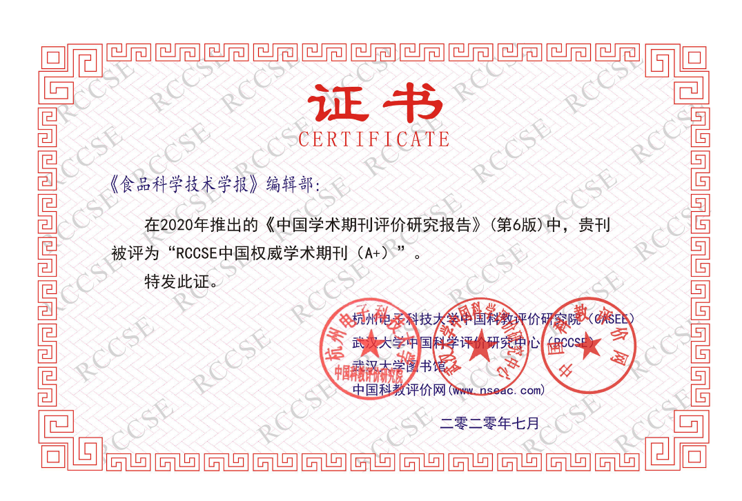 近日,RCCSE《中国学术期刊评价研究报告》(第6版)正式发布,公司主办的《食品科学技术学报》被评为“RCCSE中国权威学术期刊(A+)”。在食品科学技术学科的51本中文期刊中,仅有3本期刊入选“权威期刊”(A+),《食品科学技术学报》排名第2位。