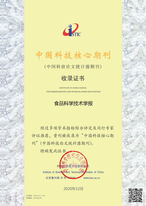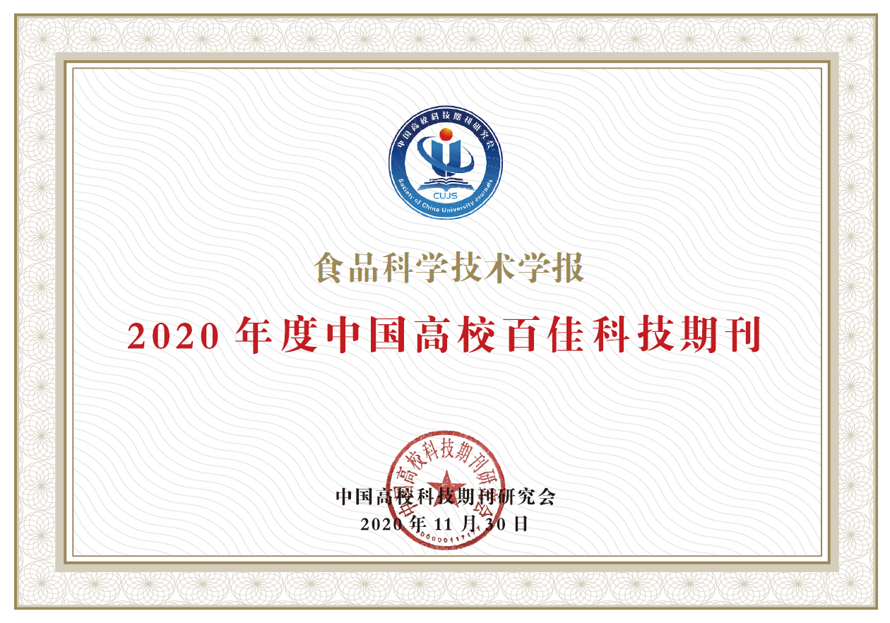 另据中国科学技术信息研究所发布的2020年版《中国科技期刊引证报告》:《食品科学技术学报》扩展影响因子上升为3.50,连续6年位列食品行业期刊第1名;刊物的其他各项评价指标也稳居食品行业期刊前列,同时期刊继续入选“中国科技核心期刊”。中国知网发布的《2020中国学术期刊影响因子年报》也显示,《食品科学技术学报》复合影响因子继续位列食品行业期刊第二名,再次入选中国学术期刊食品科学技术类影响力指数Q1区。