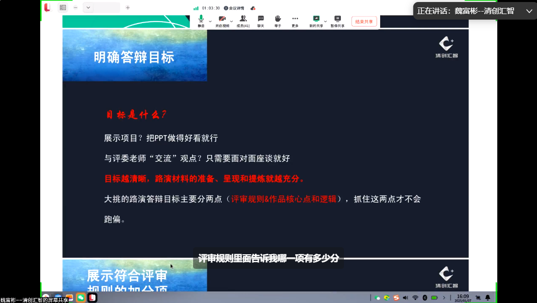 魏富彬专家主要讲述了答辩过程中的一些技巧和方法,包括如何应对不同的问题,如何制作PPT进行答辩等。同时,也介绍了比赛的形式和评审规则,以及如何在比赛中出色地展示自己的作品:在答辩过程中,要注意保持冷静,确保回答问题的准确性;此外,团队协作也非常重要,要提前熟悉电脑系统的PPT播放,进行多次练习;在答辩时,要突出重点,展示作品的创新性和社会价值,同时也要注意语言表达和感染力。