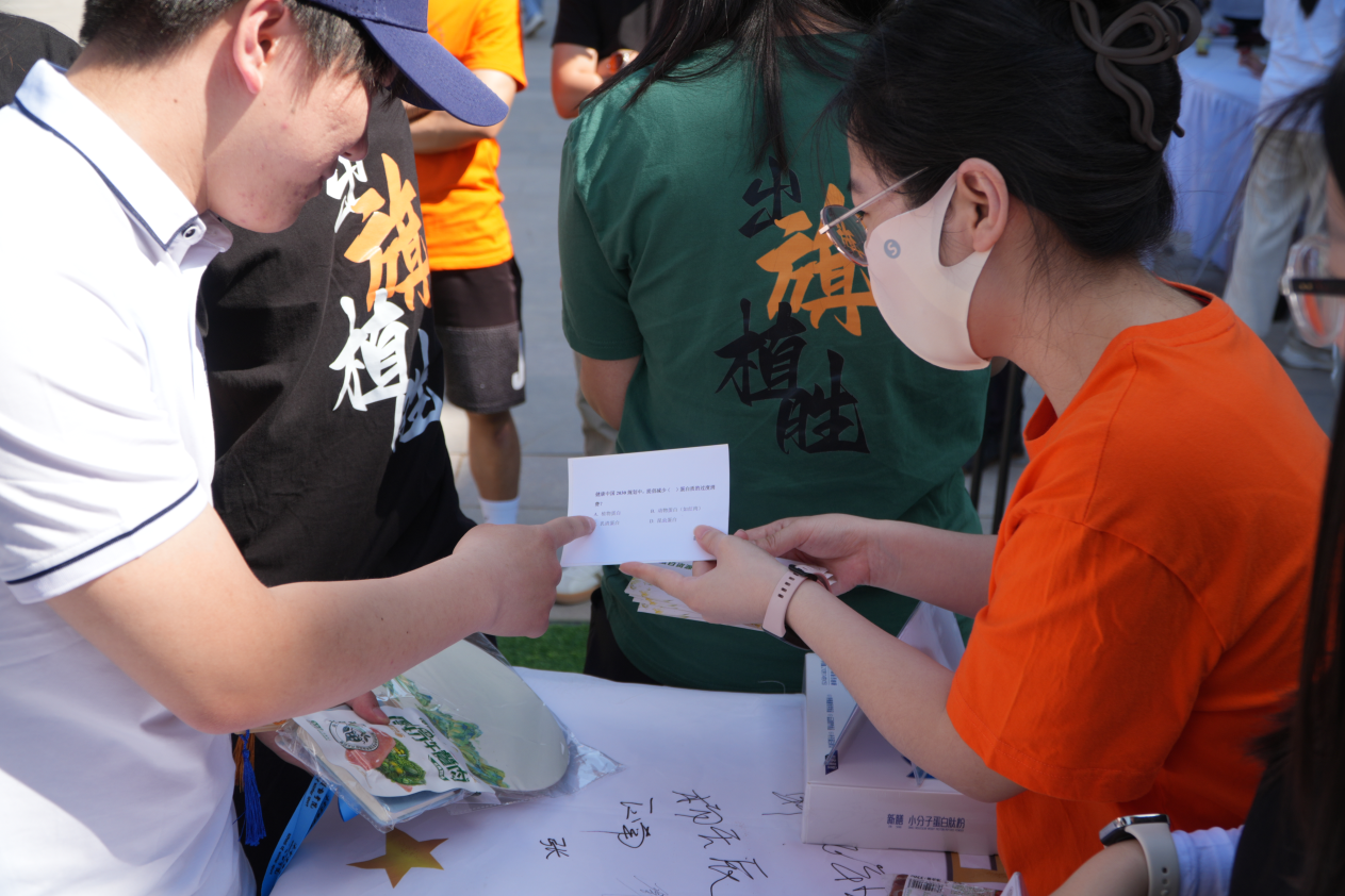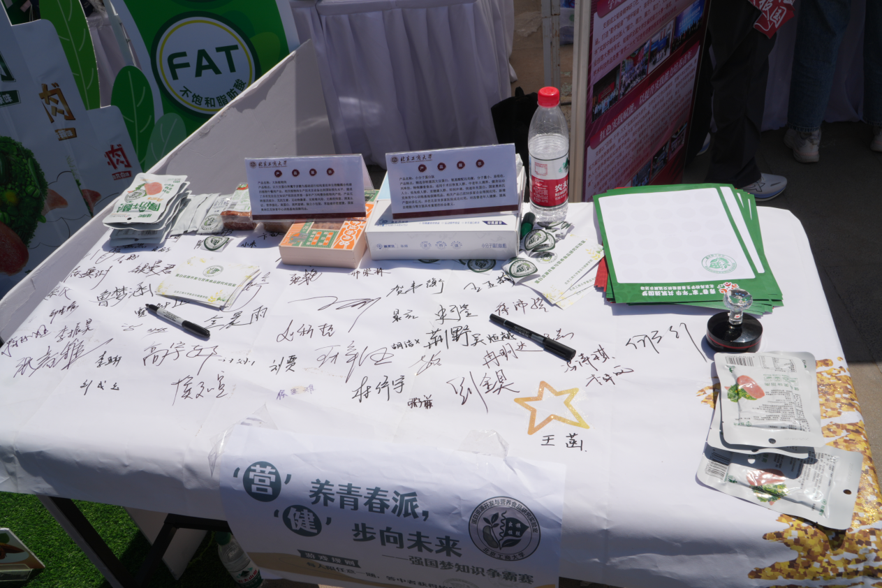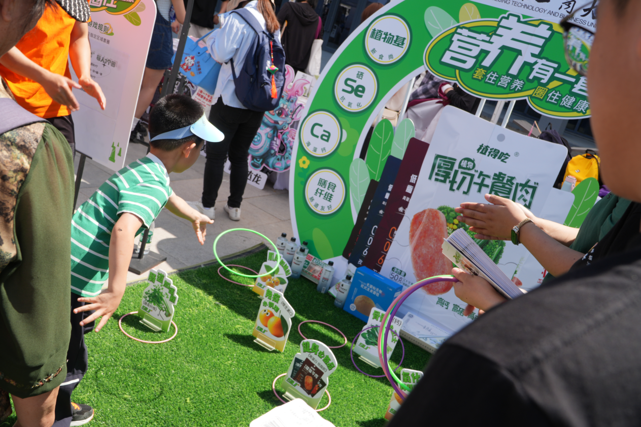 活动现场,实验室团队精心设计了主题互动区,包括“营养有一套”主题互动区和将健康常识转化为趣味科普的答题区。参与者通过套圈游戏赢取实验室自主研发的植物肉、大豆肽粉等健康产品,并参与营养知识问答,在互动中了解蛋白营养与健康益处。活动现场还展出了团队在服务国家战略、科技创新、人才培养及团队建设方面取得的成果,诠释了“铸魂之家、创新之家、育才之家、幸福之家”的团队理念,吸引众多师生驻足交流。