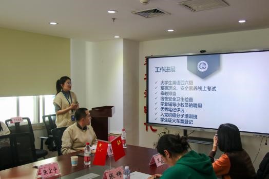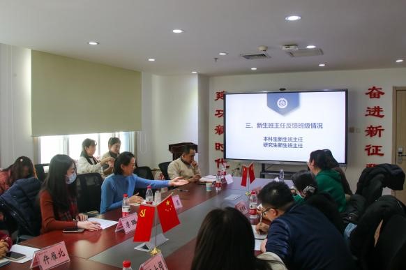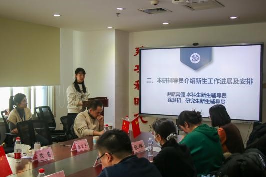 随后,研究生新生辅导员徐慧韬和本科生新生辅导员尹皓霙倢分别介绍新生工作进展以及后续工作安排。徐慧韬就员工心理健康安全、网络安全、宿舍安全及实验室消防安全等方面进行了总结。尹皓霙倢对当下的员工工作进行了总结,并提出了今后的工作安排,希望新生班主任关注新生心理健康,提前组建班级学习小组,并在期末考试前对新生进行诚信考试教育。同时,尹皓霙倢从学风建设以及班级建设的角度出发,提醒班主任提前关注员工评奖评优相关的硬性指标,以及优秀基层组织的考核指标,并希望班主任能给新生提供学术科研的平台。