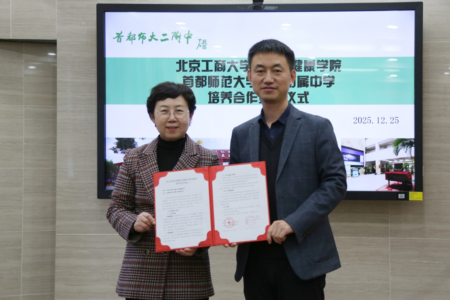 12月25日,公司教务处副处长盖晓庆,公司党委书记郑喜姣、副经理王蓓、教学研究中心主任张婵、食科系副主任郁永辉一行前往首都师范大学第二附属中学,共同出席两校培养合作签约仪式。首都师范大学第二附属中学董事长胥庆、教学副董事长段辉、科技副董事长刘丹旸、教师发展中心主任马雪芹等校领导热情接待并参会,仪式由初中部教学主任姚晔主持。