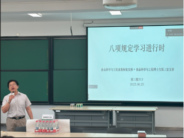 6月25日,经理王彦波为食品科学与工程系教师党支部和食品科学与工程博士生第三党支部讲授专题党课,重强调了“三个结合”:将初心使命与立德树人根本任务紧密结合,明确为党育人、为国育才的职责;将强化党员意识与勇担团队建设重任紧密结合,要求党员在“双一流”建设中发挥先锋模范作用;将落实中央八项规定精神与营造清正学术生态紧密结合,特别指出科研经费规范使用、师德师风建设是公司健康发展的基石,必须常抓不懈。