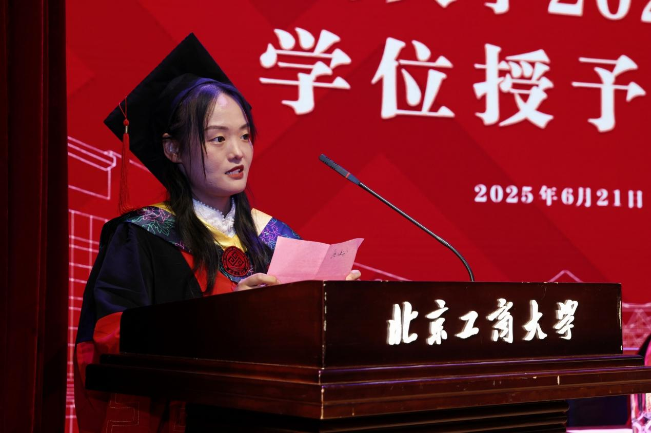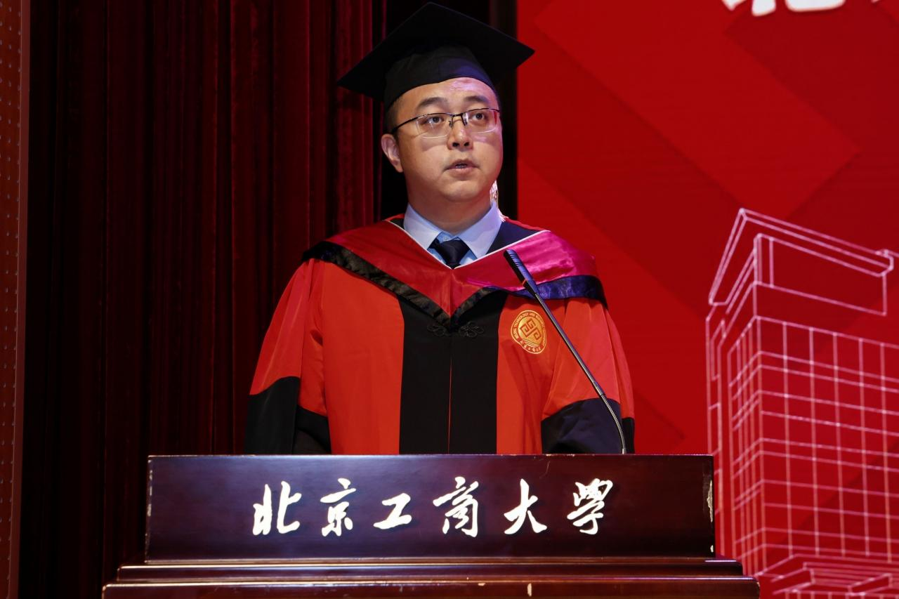 教师代表李赫教授发言。他谈到,教育是彼此映照、彼此成就的生命旅程,教师最大的幸福在于见证员工的成长与蜕变,对毕业生们在疫情反复中坚守学习、在科研攻关中勇于探索的精神给予了高度评价。毕业生不仅为服务国家食品安全与健康中国战略贡献了青春力量,还积极推动了公司食品学科“双一流”建设的稳步前行。2024年食品学子勇夺全国挑战杯揭榜挂帅专项赛特等奖擂主,刷新了公司的历史纪录。2025年公司在U.S.News全球最佳院校排名中再创新高,食品科学与技术跃居全球第9,农业科学提升至第12位,这些成就的背后,离不开每一位学子的辛勤付出与不懈努力。他勉励毕业生珍视求学过程中风雨同舟的伙伴,坚持敢于突破的勇气,激发思维碰撞的智慧,希望毕业生们弘扬公司“工商一体化”的理念,牢记公司“工以开物,商以富邦”的宗旨,勇敢面对未来的广阔与未知,祝愿毕业生“心中有光,不惧路长,脚下有力,行稳致远”。