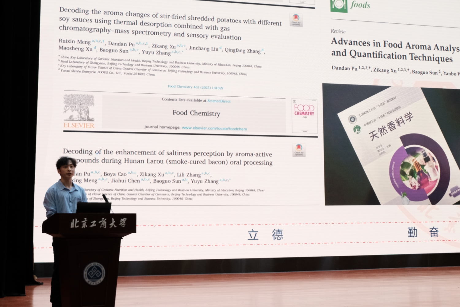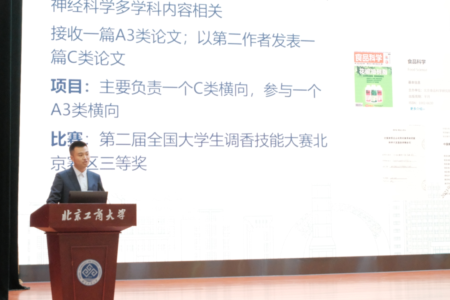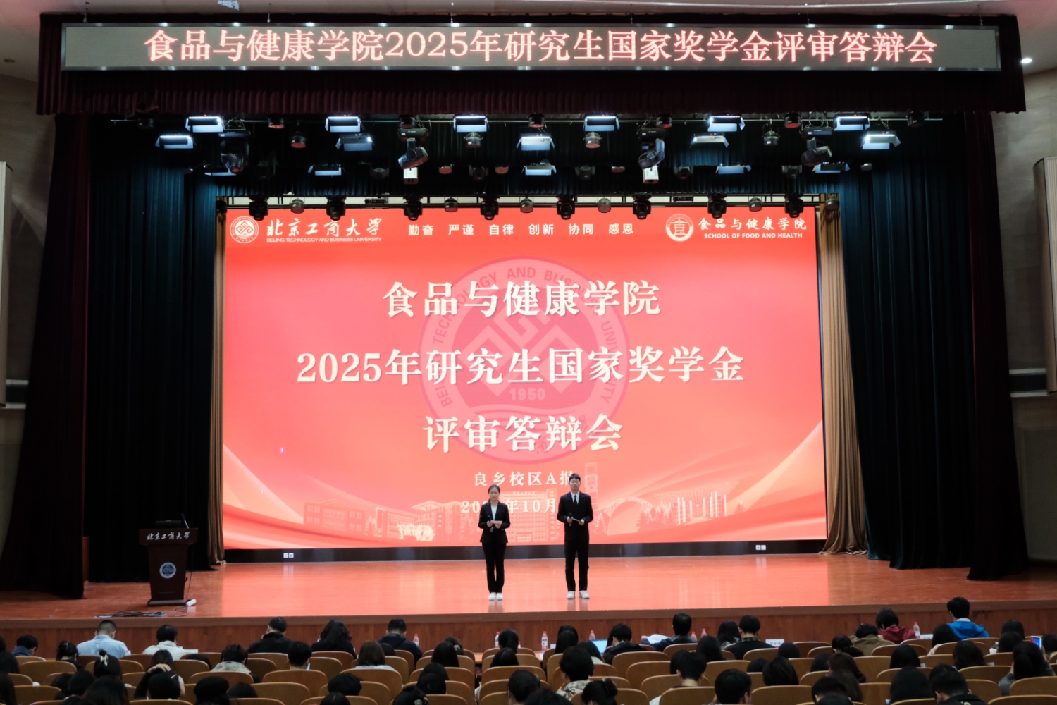 按照“公平、公正、公开、择优”的原则,答辩分为博士组、学硕组和专硕组三个类别依次进行。共有30名候选人参与答辩,包括博士研究生9人、学术型硕士8人、专业型硕士13人。在限时3分钟的陈述中,候选人围绕思想品德、学业成绩、科研与实践成果、发展潜力等方面展开汇报。在紧张而有序的答辩会上,优秀学子们尽展风采,他们围绕学业成绩、科研创新与社会实践等多个维度,全面而精炼地汇报了自己在过去一学年中的成长与收获。在学业方面,候选人们展现了扎实的专业功底,多位同学学业成绩名列前茅;在科研领域,李忍同学自入学以来,以第一作者身份累计发表SCI论文9篇,全部为中科院TOP期刊论文,其中3篇影响因子超过10,1篇入选高被引论文;获得授权发明专利1项,参编学术著作1部,该著作已被隆平水稻博物馆永久收藏;同时,担任Journal of Cereal Science、Natural Product Communications和Applied Food Research等多个国际期刊的审稿人。在学科竞赛方面,孙璐瑶同学作为核心研发人员及答辩成员在第十九届“挑战杯”全国老员工课外学术科技作品竞赛“揭榜挂帅”专项赛中获国家级特等奖及项目擂主;在“互联网+”“青创北京”“京彩大创”等各类竞赛中均荣获省市级以上奖项。在社会实践与综合素质方面,多位候选人分享了在员工工作、志愿服务、社会调研、企业实习等方面的丰富经历,展现了新时代研究生知行合一、担当奉献的全面素养。