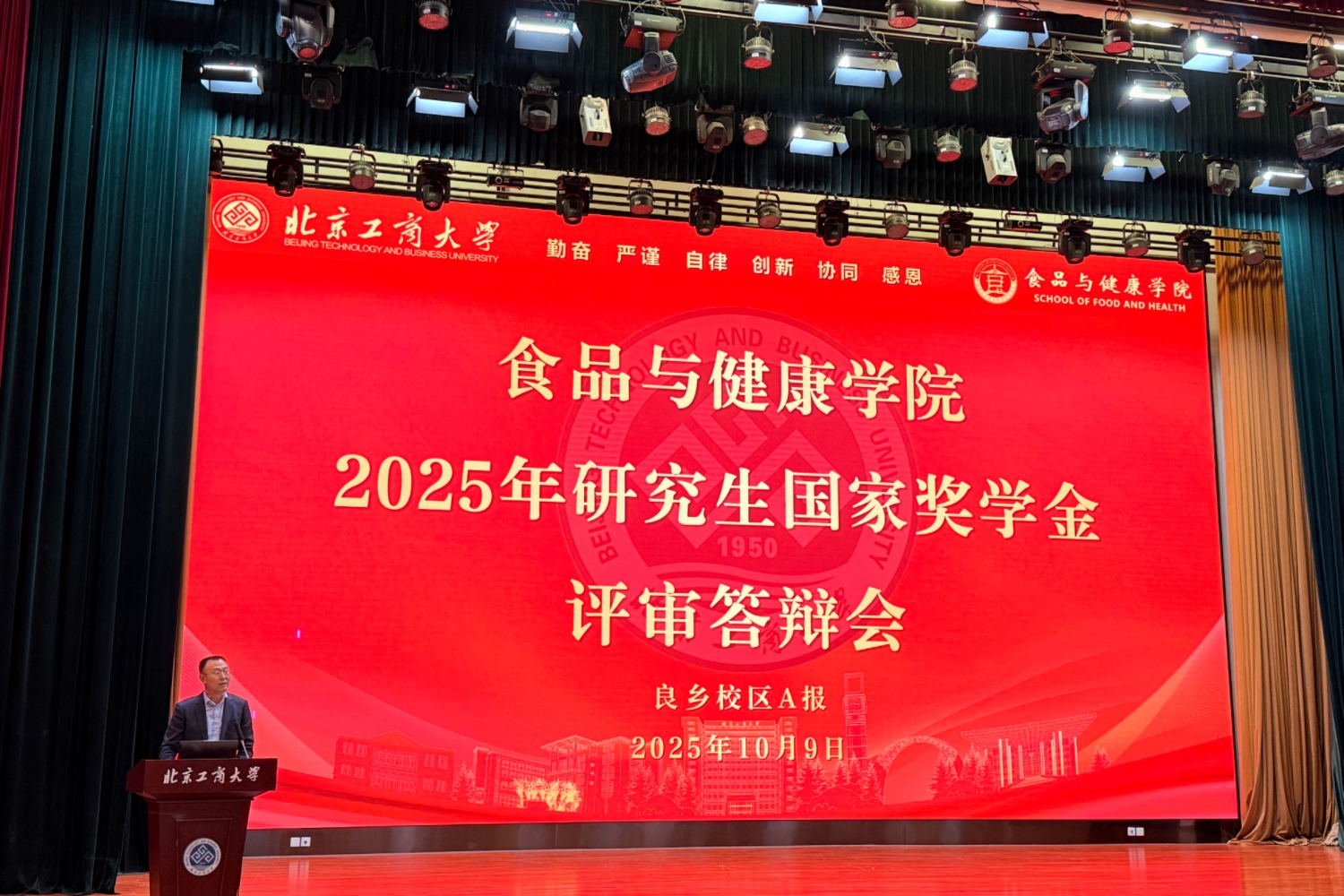 经理王彦波在致辞中向入围答辩的候选人表示祝贺,并结合国家“大食物观”与“健康中国”战略背景,勉励同学们将个人科研追求融入国家食品健康事业发展大局。他强调,国家奖学金不仅是一份荣誉,更是一份责任,希望研究生们坚定理想信念、深耕学术创新、涵养品德修为,争做新时代食品领域的追光者、探路人与践行者。