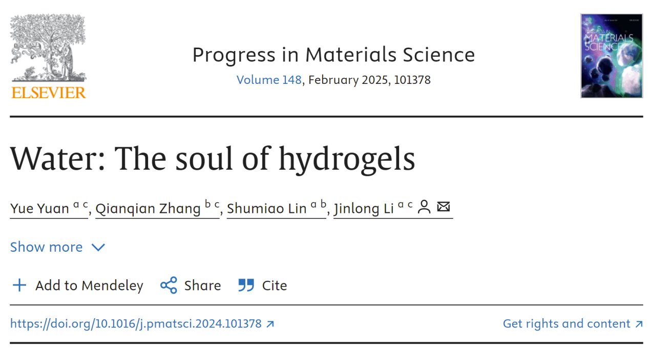 近日,公司食品营养与健康系郦金龙教授以通讯作者在材料领域顶级期刊Progress in Materials Science(IF=33.6,CiteScore=59.6)在线发表了题为“Water: The soul of hydrogels”(水:水凝胶的灵魂)的高水平综述论文,公司博士研究生袁玥为该论文第一作者。