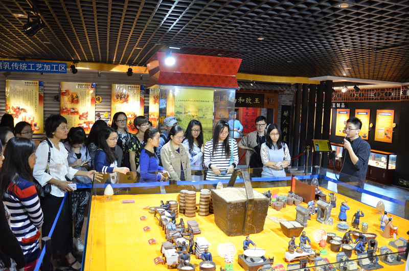 在此次活动中,同学们首先在王致和食品有限公司刘部长的讲解下,共同学习了腐乳的传统生产工艺流程,以及国有企业自主创新的新型腐乳生产产业化模式,系统生动的了解了产品从生产加工到成型装箱的整个过程。然后,同学们在专业技术人员的陪同和引导下,有秩序的参观了腐乳生产过程中最重要的生产环节,从豆腐打胚、前期发酵,到装罐、浸汁,同学们在参观中不断思考,所提出的相关问题,专业人员都细心做出了详细的解答,同学们还有幸零距离接触到了长满菌丝的腐乳胚,更加生动的了解到了腐乳手工制作的无限魅力。随后,大家在讲解员的带领下参观了王致和厂史博物馆,厂史陈列通过大量的文字、图片及实物的展示,介绍了这家百年企业的悠久历史、发展进程和经营现状,使同学们对王致和企业的历史、发展、现状有了更为深入的认知和理解。整个参观过程中所有人都兴致盎然、认真投入。