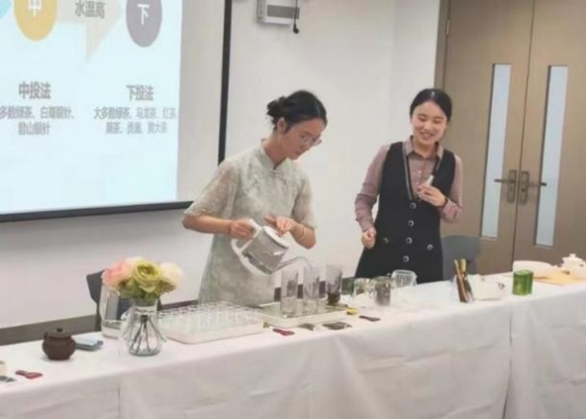 郭天洋老师首先从茶的植物学与社会学起源、茶的发现和传播、饮茶行为和发展等方面提出了充分的历史性证据,随后又从泡茶的三大要素、专业的投茶方式以及不同材质的泡茶容器为大家介绍茶文化知识。为了让观众并由两位茶艺爱好者对讲解内容进行了专业的泡茶展示。