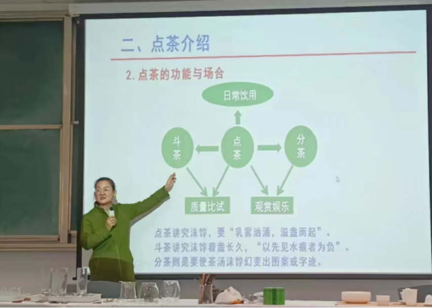 何亚荟老师则以当下大火的电视剧《梦华录》中“赵盼儿”的点茶过程为教材,从茶的历史演变、点茶的介绍、点茶的操作流程以及分茶技法这四个方面,让大家充分了解“点茶”;并亲自示范点茶全过程。同时在点好的茶上手写“二十大”,用实际行动庆祝党的二十大胜利召开。