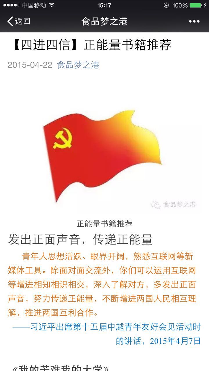 通过微博、微信等媒体平台,形成线上线下两个平台的互动。公司团学微信公众号“食品梦之港”开设“食·天下事”“四进四信”“食力青春”等专栏,以深入浅出的方式为同学们解读“四进四信”的深刻内涵,对社会热点问题进行及时报道。每日提炼团中央、北京团市委和校团委微信公众号中精彩学习内容和成果进行发布,引导青年员工自觉学习专栏内容并转发、评论。借助新媒体打造原文学习、资料查询、心得分享的交流共享平台,实现学习宣传讲话精神的日常化、长期化。