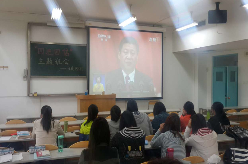 开展一次主题团日活动。各团支部结合学习交流的方式宣扬“四进四信”精神,通过解读班级学业状况和问题,确立新的班级目标,将学习方法改进措施细化到每位同学,使大家树立学业为先的信念。在反法西斯战争胜利70周年之际,有的团支部组织同学来到中国人民抗日战争纪念馆或国家博物馆进行参观,大家从不同侧面、多个角度了解当年全国抗战形势,重温党的光荣历史,接受一次深刻的爱国主义革命传统教育。参观结束后,同学们也表示会更加刻苦学习,知行合一,努力争做践行社会主义核心价值观的模范。
