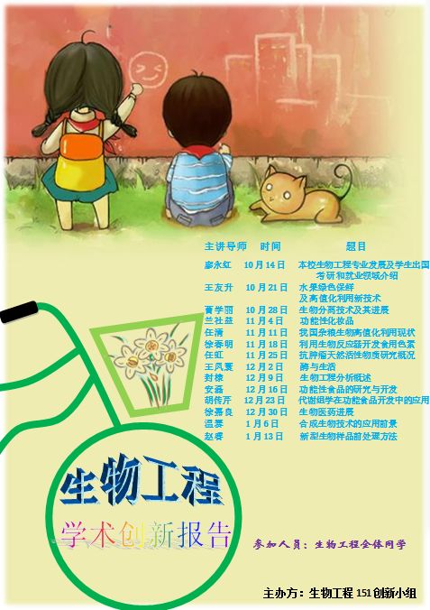 本次报告会受到了胡燕霞书记及生物工程专业各老师的大力支持,老师们纷纷表示,将把自身研究领域内知识和经验倾囊相授。同学们也以饱满的热情积极响应。本次活动旨在加深同学们对专业学习的理解,树立对本专业的自信,培养对本专业的学习兴趣。yl6809永利生物工程专业新生学术创新论坛系由生物工程151学习创新小组主办,论坛从10月14日开始,持续14周,每周三下午5,6节在良乡校区进行系列学术报告,欢迎全校师生参加。