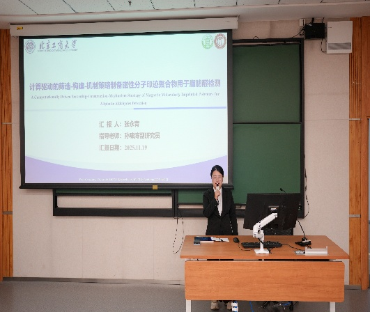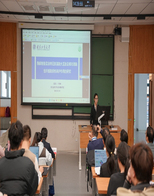 九位汇报人分别围绕“基于人群多靶点健康效应的优先控制污染物识别”“风味代谢指纹图谱结合化学计量学表征牛奶储藏中风味特征”“计算驱动的筛选-构建-机制策略制备磁性分子印迹聚合物用于脂肪醛检测”“酶解制备富含特征氨基酸大豆肽及其对酒精性肝细胞损伤保护作用的研究”等课题,进行了学术汇报。报告人逻辑清晰、表达流畅,面对老师的提问从容应答,展现出扎实的专业基础与良好的科研素养。专家评委针对每位汇报人的研究内容进行了精彩点评,既肯定了研究的创新点与可行性,也提出了建设性意见,为同学们后续研究指明了方向。