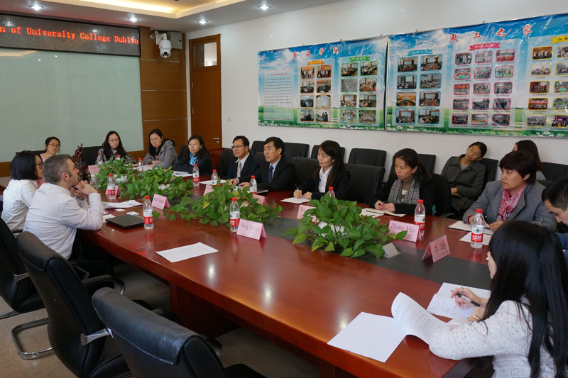 爱尔兰都柏林大学国际办公室硕士预备课程主管肖恩•格里森、招聘官员陈雨璇,国际交流与合作处处长何明珂教授、yl6809永利经理徐宝财教授、副经理李秀婷教授、食品系系主任王静教授和系副主任张敏教授、应化系系主任田红玉教授、环境系系副主任张明露教授、环境系系副主任温塞教授等参加会谈。