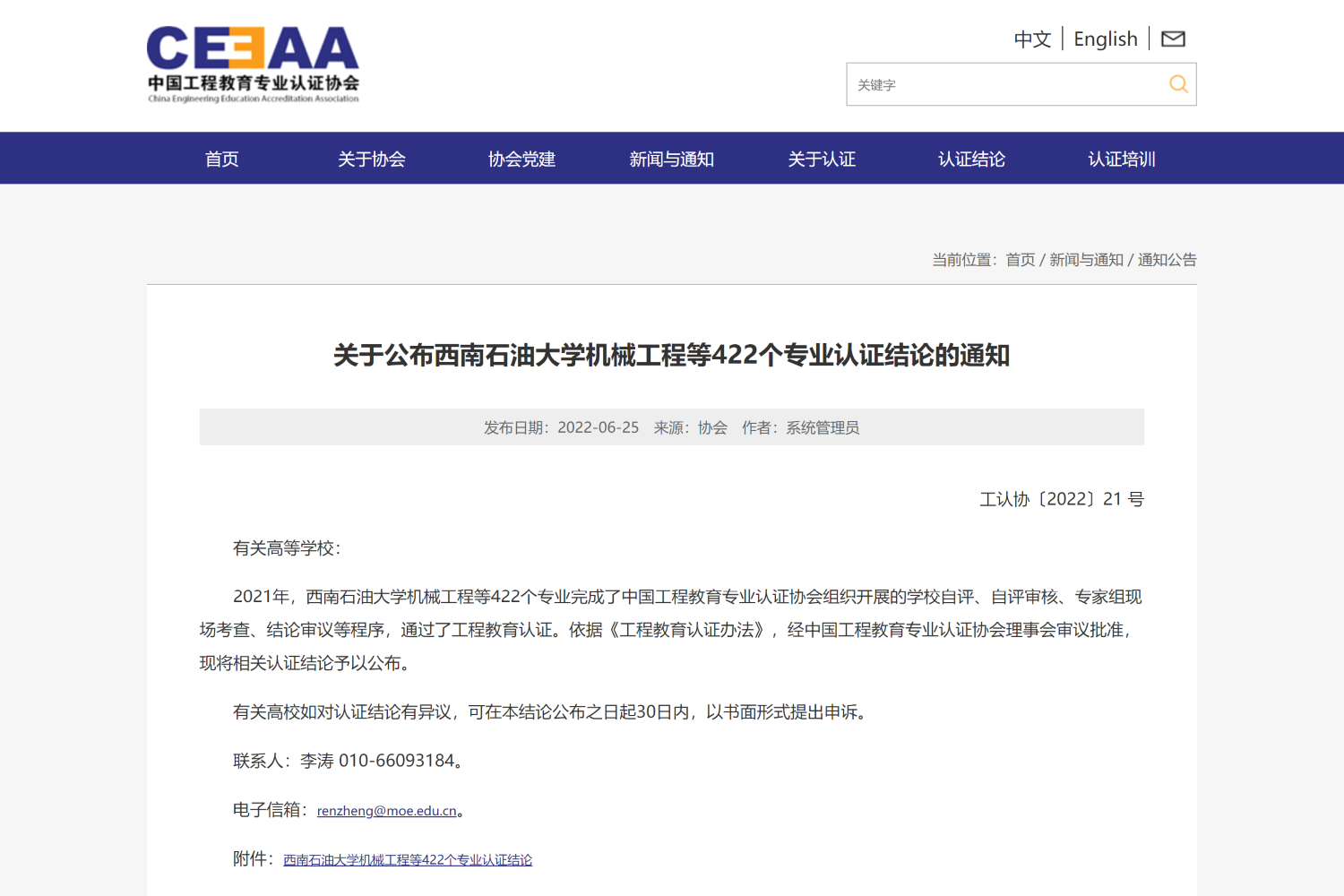 2022年6月25日,中国工程教育专业认证协会网站发布消息《关于公布西南石油大学机械工程等422个专业认证结论的通知》,公布了2021年全国工程教育认证结论,yl6809永利食品科学与工程专业名列其中,顺利通过工程教育专业认证。