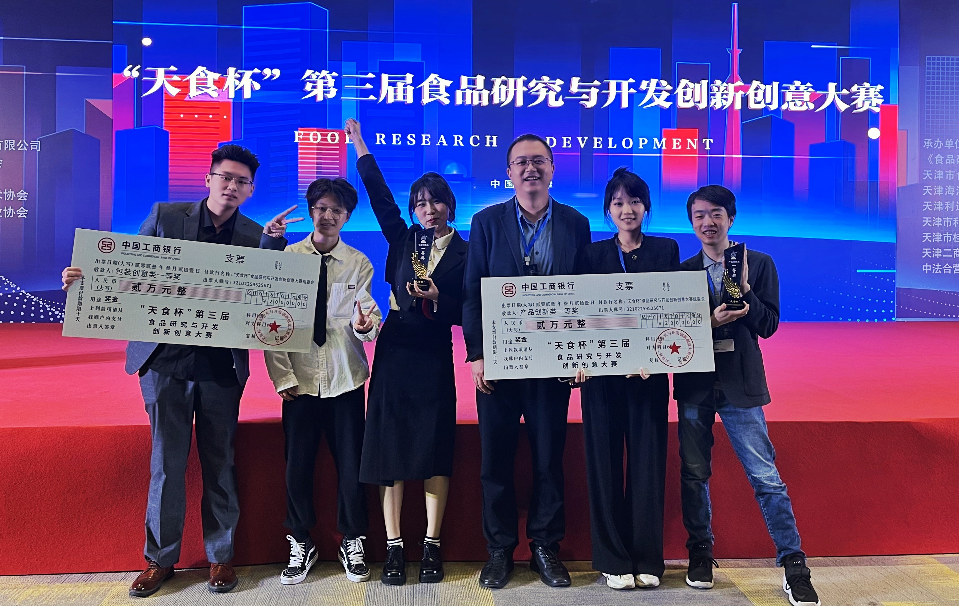 两支参赛队伍分别是由李赫教授指导的顾翊瑄、魏莱等人的作品——“出奇植胜——低脂植物肉番茄辣椒酱”、由龚凌霄副教授指导的陈芮、沈振远、李宇轩等人的作品——“津年”。参赛作品于决赛当天进行现场展示与评比,最终分别斩获产品创新类一等奖和包装创意类一等奖。