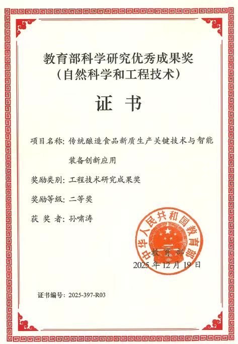 近日,2025年度教育部科学研究优秀成果奖(自然科学和工程技术)获奖名单公布。公司副研究员孙啸涛作为第3完成人、公司作为第2完成单位参与完成的“传统酿造食品新质生产关键技术与智能装备创新应用”项目,荣获工程技术研究成果奖二等奖。