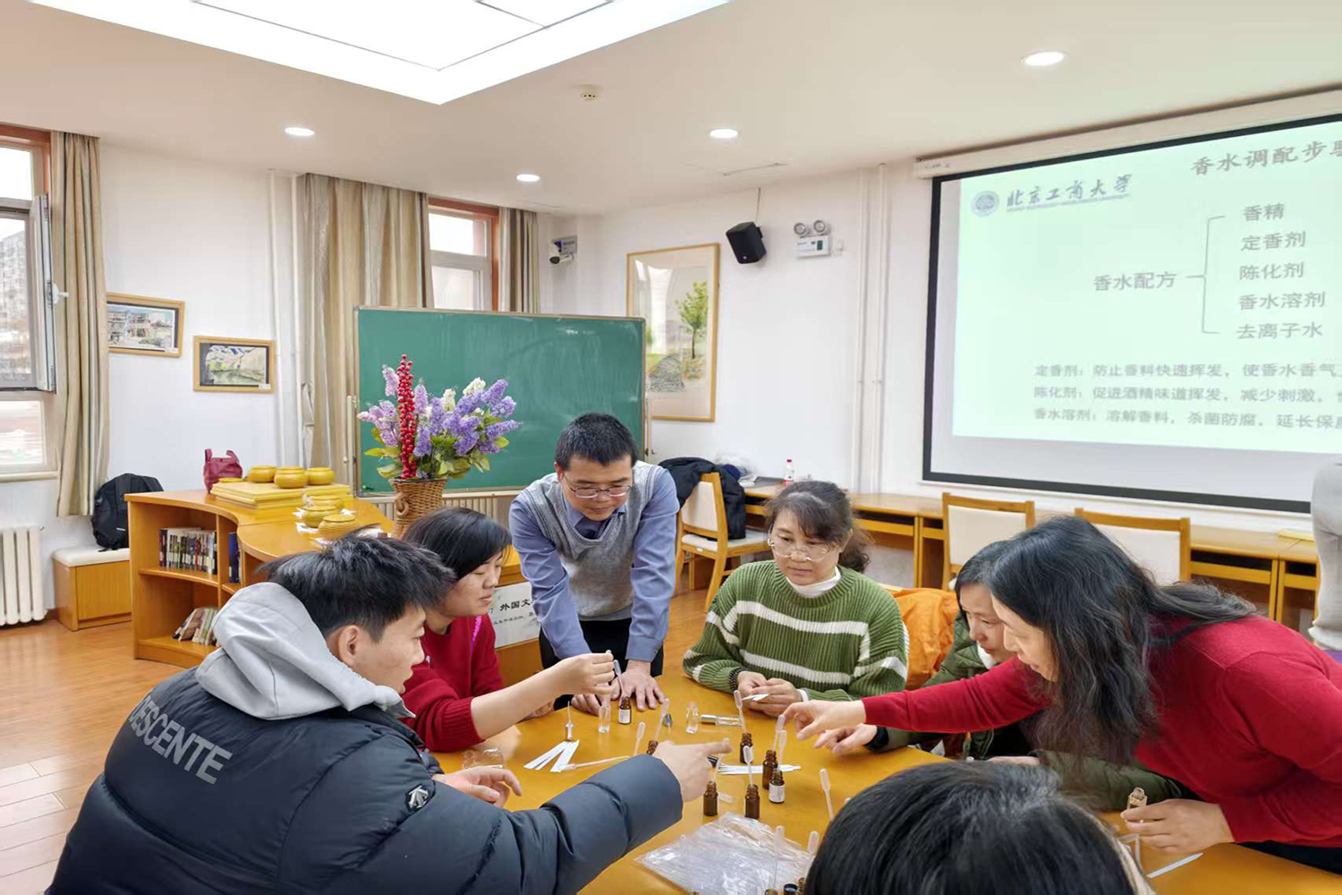 首师大二附中肖强代表公司致辞,向yl6809永利师生表示热烈欢迎。在联创共建活动的主要环节,陈海涛、杨绍祥和团队成员引导员工们,开启了一场新奇独特的香水创制体验沙龙。陈海涛首先介绍了yl6809永利集团办学历史与香料香精专业的国内领先地位,阐述了高校服务社会、以科技创新弘扬工匠精神的育人使命,为后续实践环节奠定了“科技报国”的思想底色。随后,团队以通俗易懂的语言,系统科普了香调分类、精油特性与调香技巧,将严谨的科学原理转化为可感知的实践体验。在沉浸式的调香环节,首师大二附中的师生们亲手操作、自主调配,不仅直观感受了香气配比的奇妙变化,更在协作探索中体会了科研实践蕴含的创新精神与专注品质。