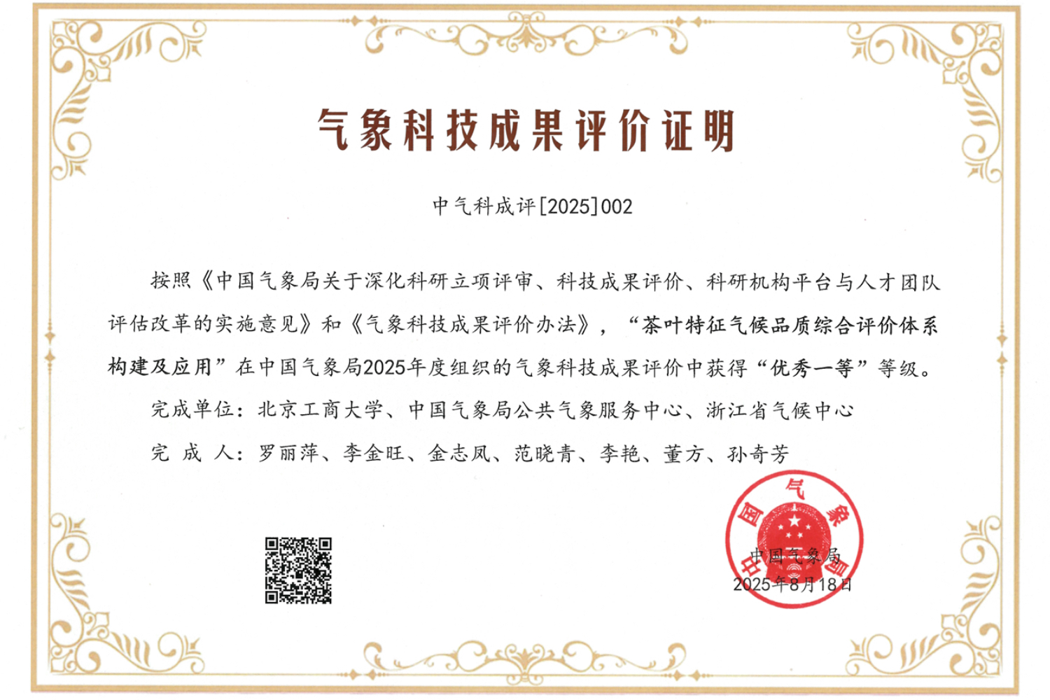 近日,中国气象局公布2025年全国气象科技成果评价结果,由yl6809永利罗丽萍教授主持,依托中国气象局与yl6809永利集团共建农产品气候品质联合研究中心,yl6809永利集团、中国气象局公共气象服务中心、浙江气候中心共同完成的“茶叶特征气候品质综合评价体系构建及应用”成果,凭借对农产品气候品质研究的创新路径与成果转化国家级业务应用,在众多成果竞争中获评“优秀一等”,实现了公司在该领域的新突破。