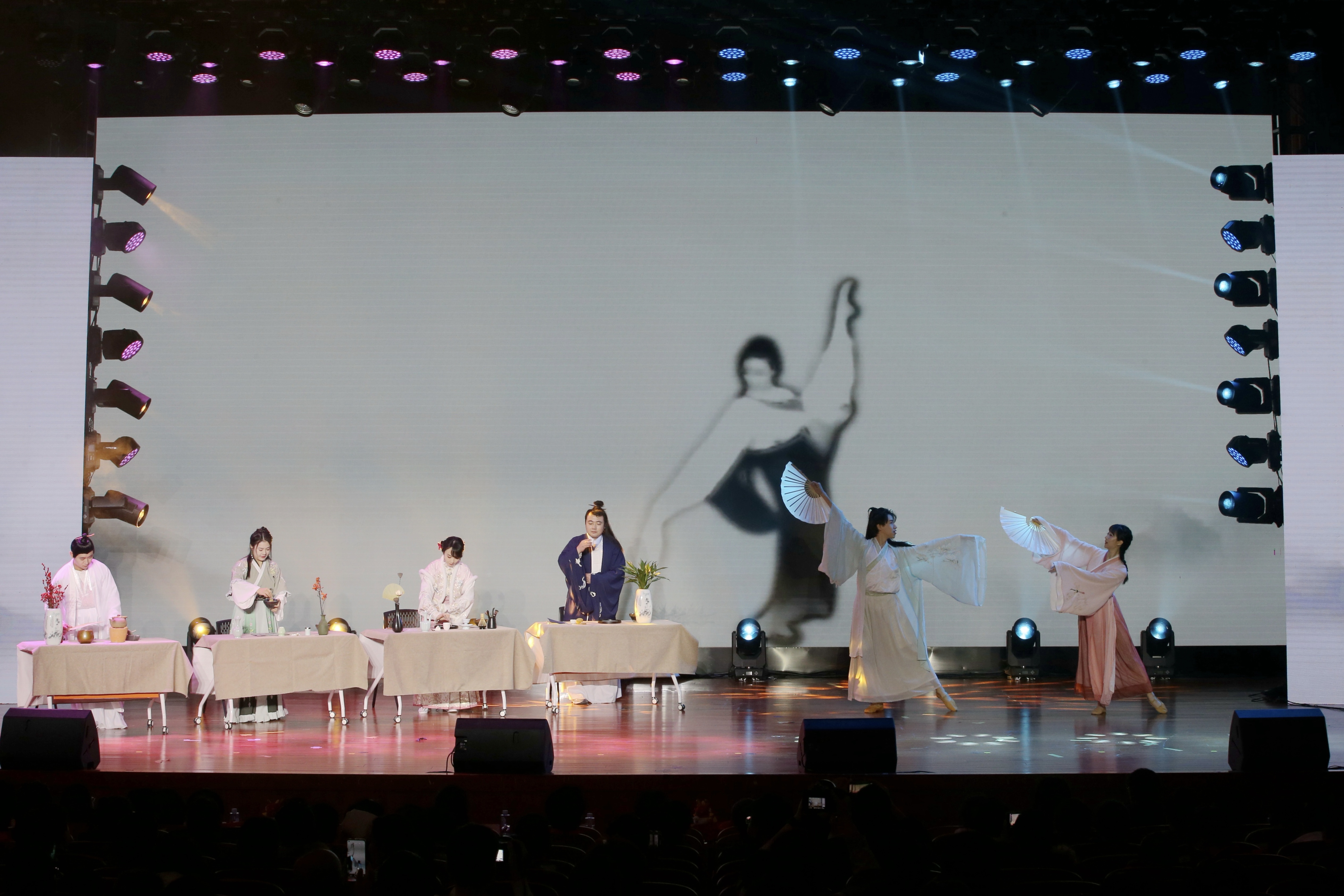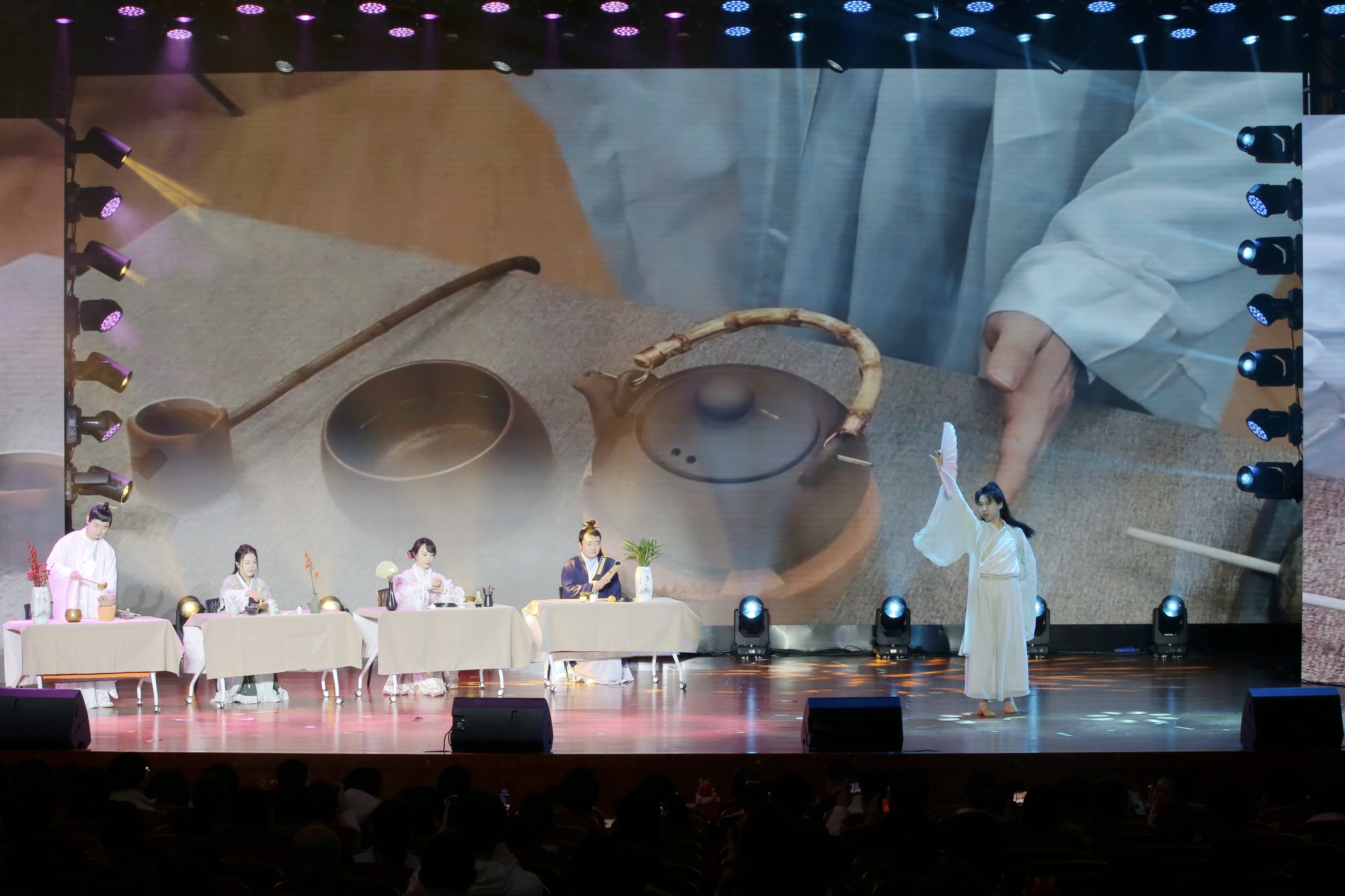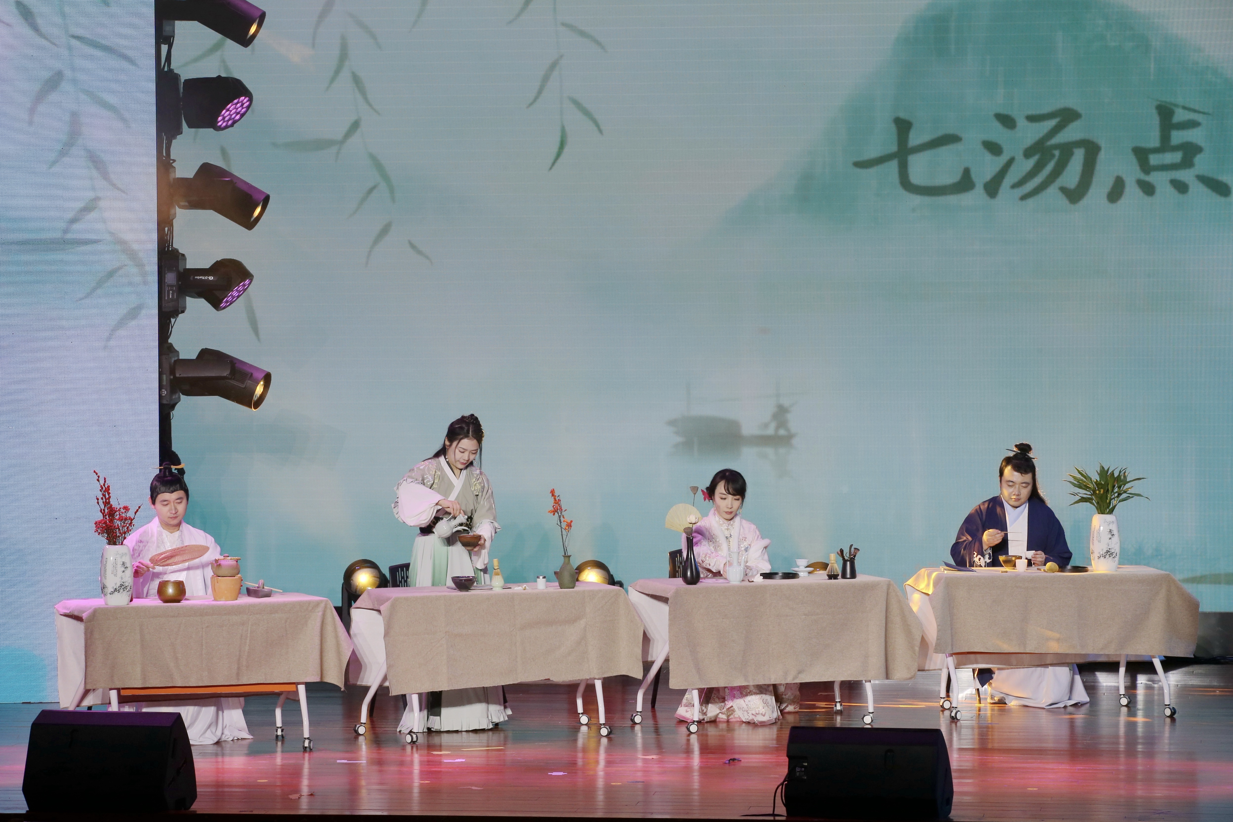 节目伊始,徐慧韬的一段古典舞《春三月》引人入胜,把观众带入风景秀丽的大自然,随后,郝帅、王金鹏、邹欣、郭明璋依次还原展示了宋代盛行的碾茶、点茶、分茶、斗茶场景,同时,韩骁默同学表演了舞蹈《禅茶一味》。各位老师把舞蹈与茶文化结合,对话风雅宋朝,以优美的表演使观众置身于古香古色的文化雅集,展现了中国文人的风骨和气韵,带给观众以美的感受。