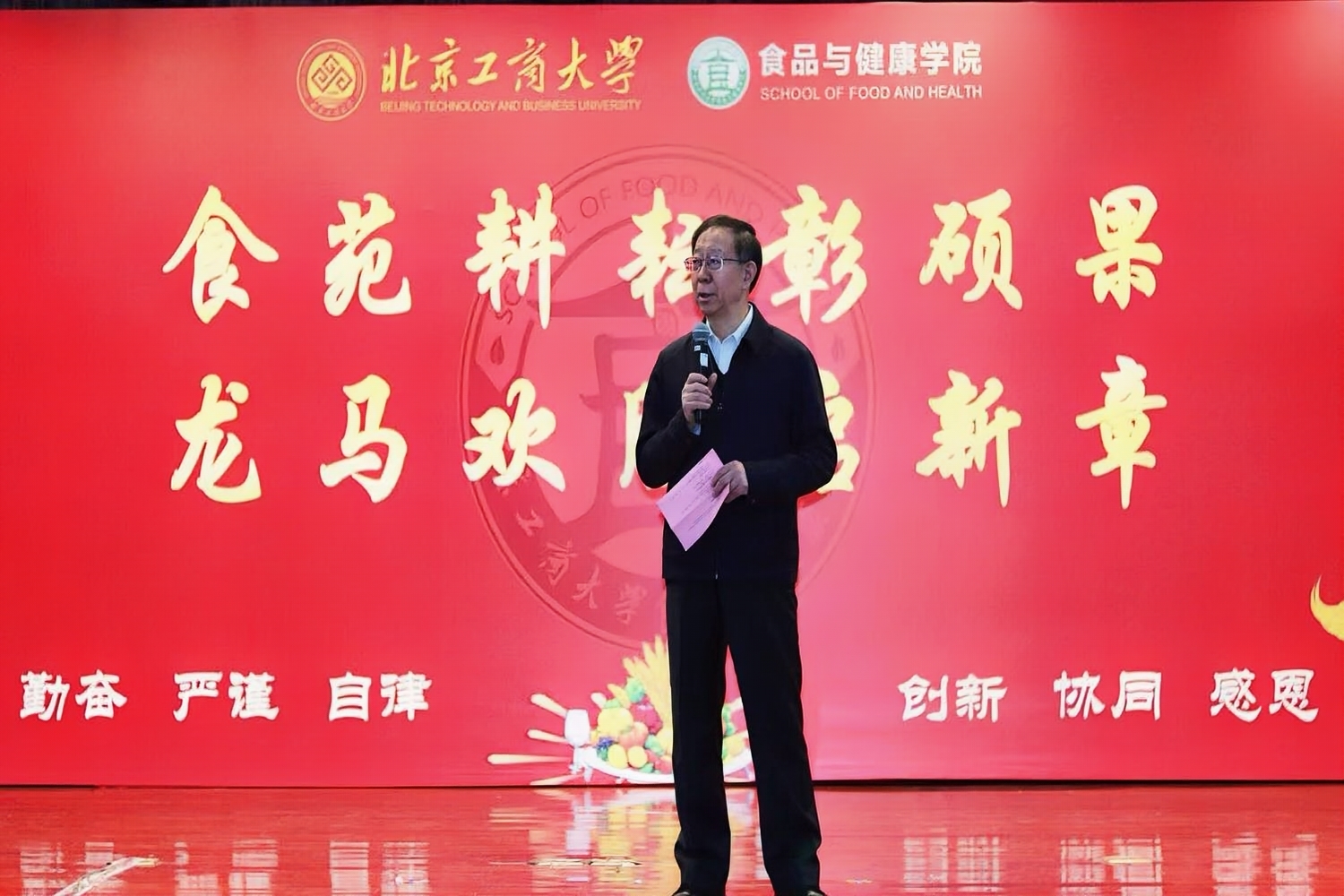 孙宝国院士结合食品学科发展与国家战略需求,化用经典歌曲《你和我》与《幸福不会从天降》,即席用歌声寄语全体教师“争创双一流不是一句口号,而是每一位教职工的责任与使命”,要以时不我待的紧迫感、舍我其谁的责任感,凝心聚力、协同攻坚、再攀新高。