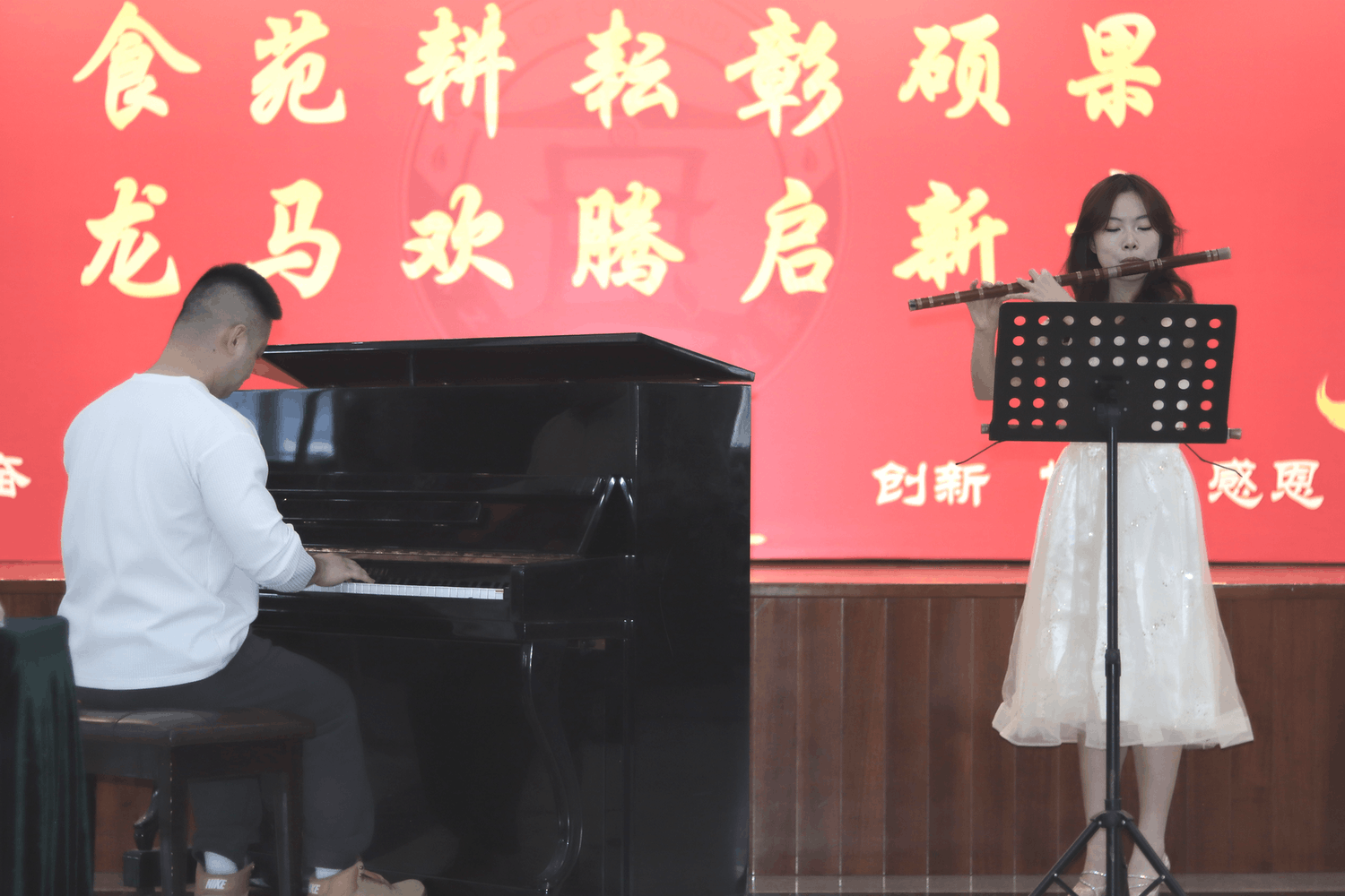 文艺汇演环节精彩纷呈。公司领导班子率先登场,小合唱《相亲相爱一家人》唱出了全院上下同心同德的感召力量;教师原创节目《食韵风华,赓续新章》、《初心如磐,食育同行》与《奋进2025 yl6809永利新篇章》,将公司育人初心与成绩荣誉娓娓道来;歌舞《卷你》、《卡拉永远OK》活力四射,点燃全场气氛;《趣味小魔术》以奇妙的变幻手法与灵动的互动设计,展现了教师跨界才艺;乐器合奏《江南》则为现场增添了一抹清雅意境。受邀参演的友好单位首都师范大学附属第二中学带来的合唱《亲爱的你啊》旋律悠扬、和声优美,彰显了两校深厚的合作情谊,为联欢会增添了别样温情。亲子特色串烧节目舞蹈《映山红》、二胡《小花鼓》、武术《精忠报国》等轮番上演,展现了教职工家庭的幸福和谐与传统文化的魅力。小合唱《小美满》与《我们都是追梦人》勾勒出师生同心、共赴未来的昂扬姿态。互动游戏“你画我猜” “马年 EMOJI 猜猜乐”“快乐传真” 与多轮幸运抽奖穿插其中,欢声笑语不断,让现场成为欢乐的海洋。在“马到福至庆联欢” 环节,公司属马或姓马的教师代表登台送福,以 “龙马精神”“马到成功” 等吉祥话语,传递对新春的期盼与公司争创 “双一流” 的坚定信心,贴合马年寓意,满含同事情谊,暖意融融。