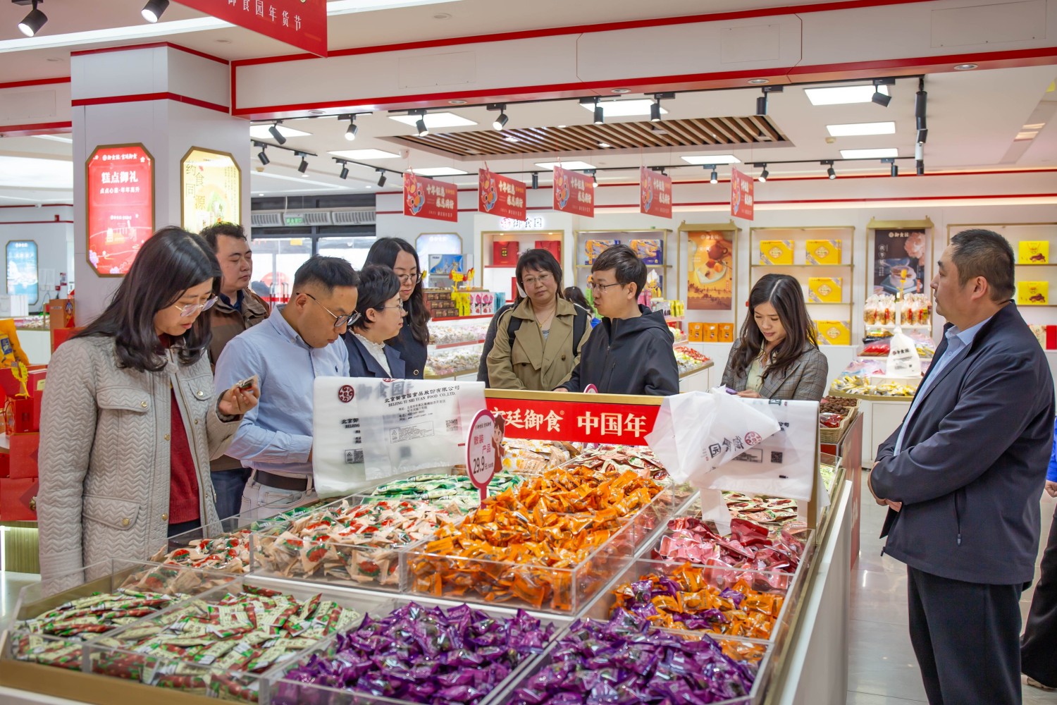 北京御食园食品有限公司总经理陈诚、人力行政总监刘瑞民、财务总监魏小灵、市场产品总监杨贺强等人热情接待了公司一行。在御食园产品展厅,公司负责人详细介绍了产品系列,从传统小吃到上市新品,从自有专利到跨界融合,每一款产品都承载着御食园对京味文化和产品创新的不懈追求。
