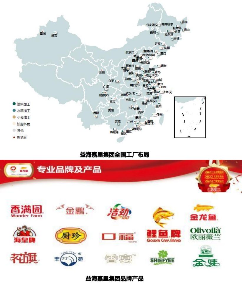 益海嘉里集团是新加坡丰益国际集团(世界500强)在中国投资的一系列粮油食品加工、销售等业务的统称。在中国的总投资已超过人民币300亿元。建立生产型实体企业130多家。主要涉足油籽压榨、食用油精炼、专用油脂、油脂化工、玉米深加工、大豆精深加工、水稻循环经济、小麦深加工、食品原辅料、粮油科技研发等产业。